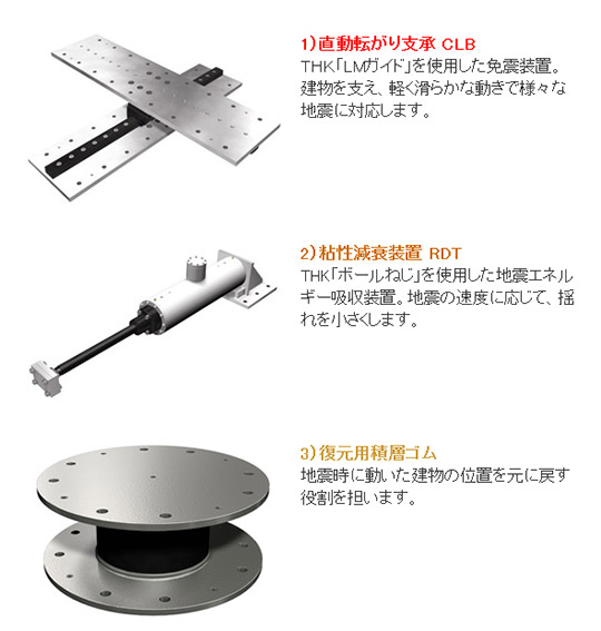 地震から大切なものを守る「THK免震システム」は、THKの主力製品であるLMガイドやボールねじを応用した地震から建物を守る免震・制震装置です。