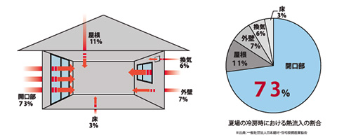 夏場の昼間の冷房使用時に、開口部から熱が入る割合は、73パーセントにも達します。