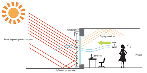 眩しさと太陽熱を抑えるとともに自然光を活用することが可能となり、空調負荷を軽減し、経済的・環境的負荷を下げるお手伝いをします。