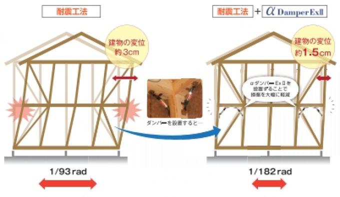 変形を約1/2に抑えお住ま いの損傷を軽減します。油圧式のαダンパーExⅡはエネ ルギー吸収量が大きく、
