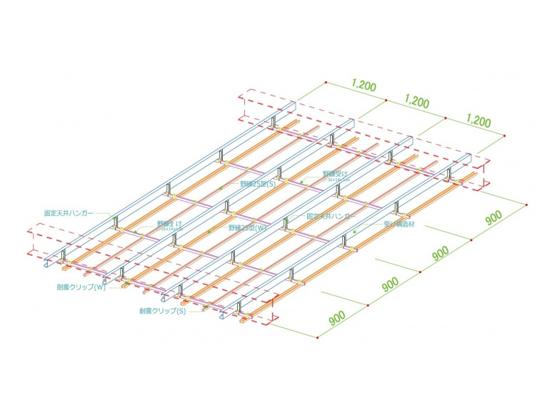 ・受け構造材ピッチは1200mmで、天井固有周期が0.05となります