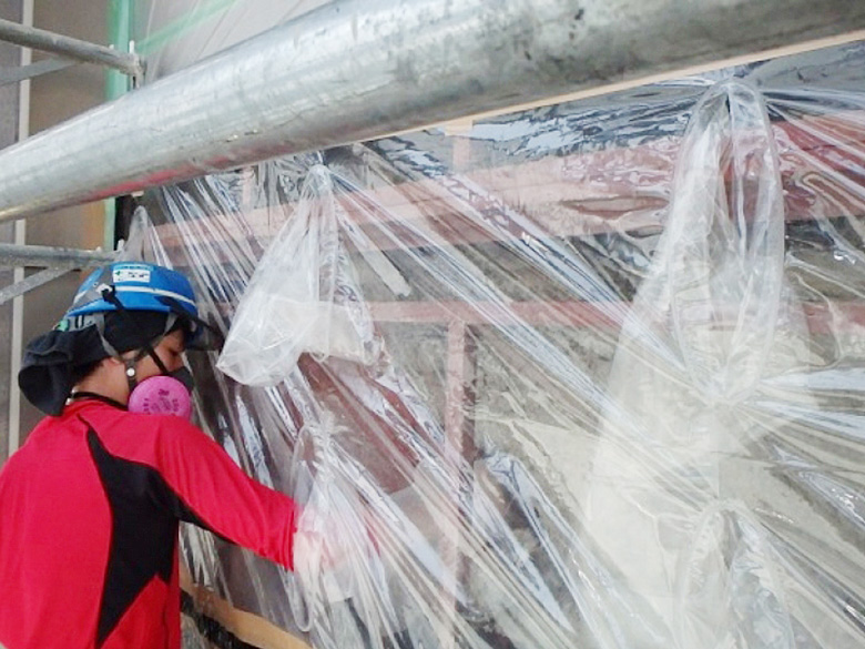 また、通常作業着と半面型マスクの装着のみで作業が行えるため、近隣の方々に余計な心配や影響を与えません。