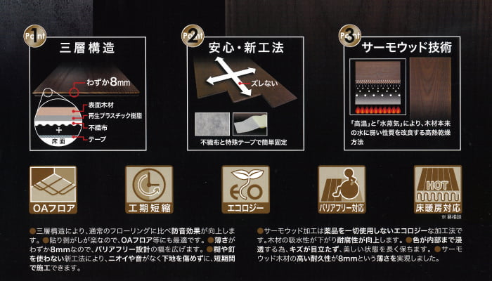 ■無垢材にサーモウッド加工を施し、プラスチック樹脂と貼り合わせることで、高性能・高機能を兼ね備えた画期的な無垢材です。他に類を見ない8mmという薄さと、圧倒的な施工時間の短縮を実現しました。
