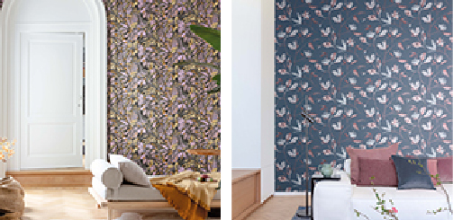 壁紙のデザインには、Blooming(ブルーミング)と名付けられた、マグノリア(木蓮)の紅赤色の花と枝葉を手書きで描いた繊細な絵柄の壁紙やBonita(ボニータ)といういろいろなヤシの木を並置し、俯瞰的に見たような一面にヤシの葉が広がる光景を描き出した壁紙もあります。