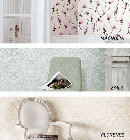 クラシックなダマスク柄が3パターンと多色使いで繊細な美しいプレーン、リネンのプレーンがコーディネートされています。縦糸整経壁紙です。