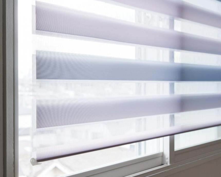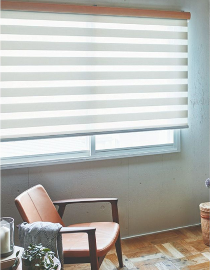 ボーダー柄のスクリーンが前後で重なり合うことで、光を自在に調光できるロールスクリーンです。