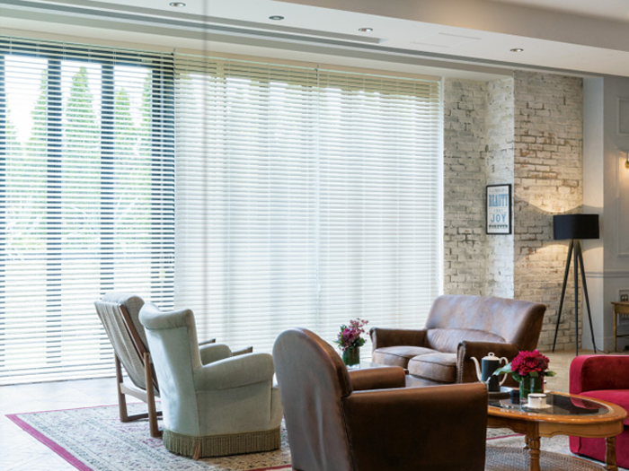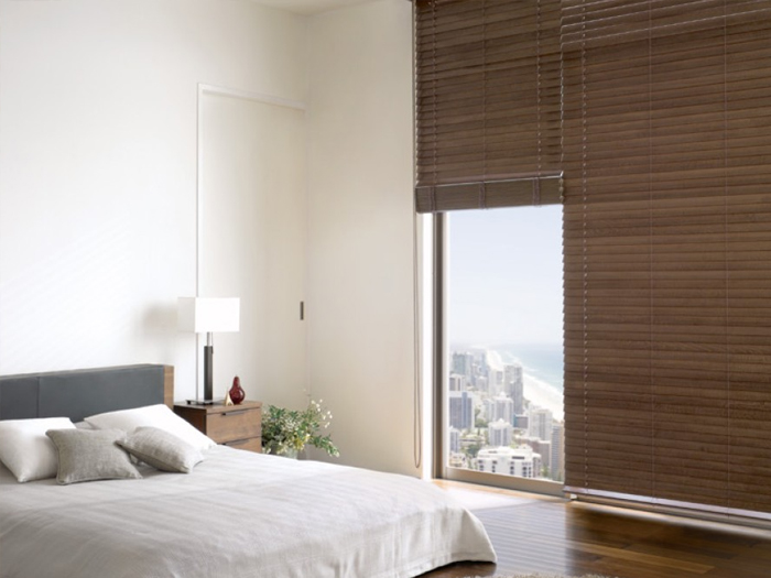 防炎に加えて耐水性を持たせた木調ブラインドはホテルのビューバス等におすすめです。もちろん一般住宅の浴室にも。ワンランク上の癒し空間を演出します。