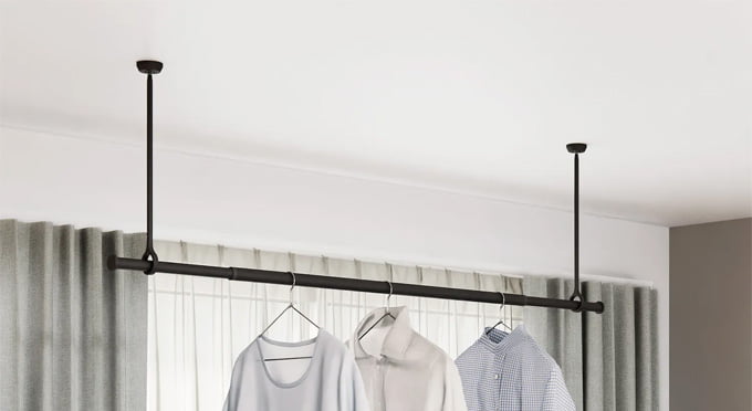 室内物干しはすでに確立された製品カテゴリーであるが、そのほとんどが極端に簡易化された頼りないものである。 それはおそらく、洗濯室や収納スペースなど普段人目につかない場所に隠されるものと考えられているため、見た 目は重視されてこなかったのだろう。しかし実際には通常、物干しは人目に触れる場所に設置される。ランドリー バーLB-1 は、天井の取り付け部分をすっきりしたデザインにするなど、あらゆるディテールに細心の注意を払って 設計されている。その結果、リビングルームでも見栄えのする器具となっている。品質面でも有望で、特に付加価 値として揺れ防止機能が付いている。