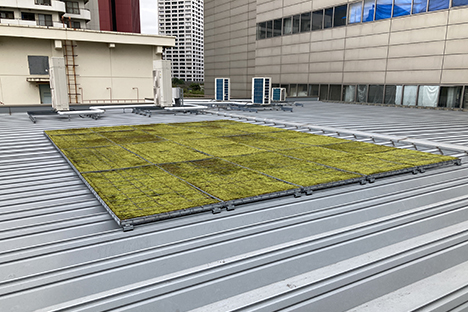 コンクリート屋根・折板屋根にも使用でき、軽量(約20㎏/m2)折板田・湿潤時のため建物への負担を軽減できます。高品質で安定したスナゴケを使用し、水やり施肥・刈込をほとんど必要としないので、ローメンテナンスとなっています。