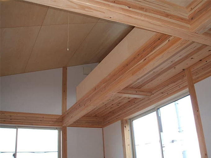 国産材を乾燥させ、木の繊維方向がクロスするように貼り合わせた三層構造のパネルで、単なるムク材とは違い乾燥による狂いが少なく強度に優れています。