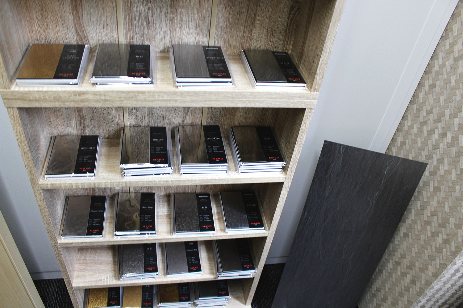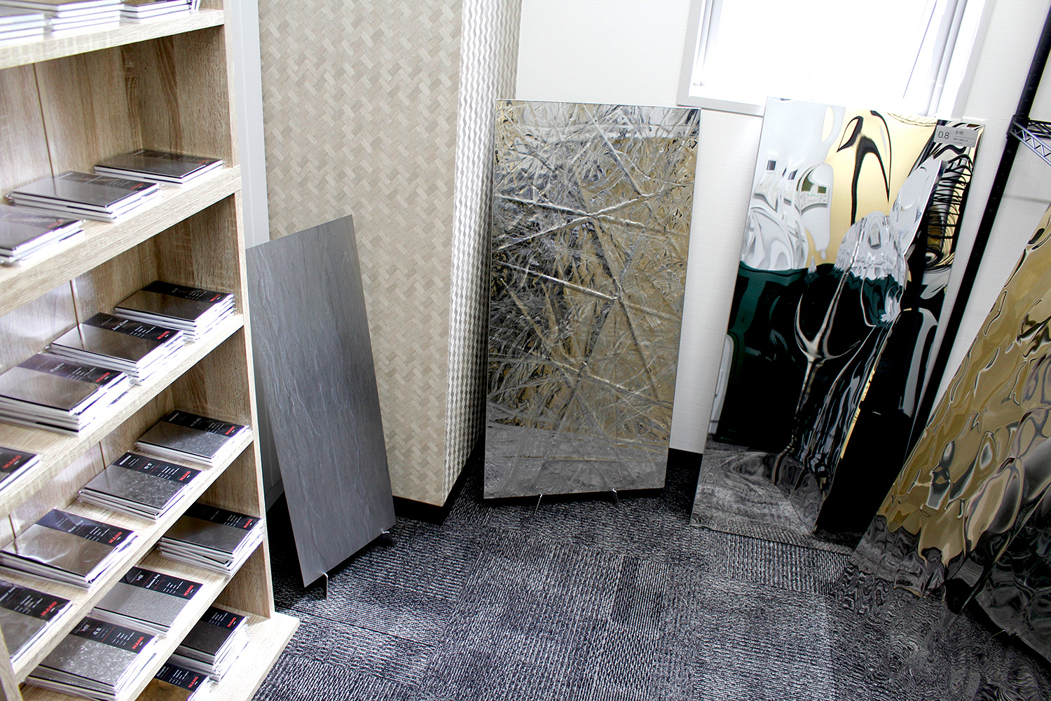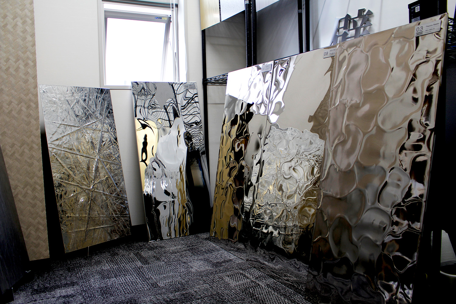 意匠⾦属MAKOの⼤型パネルやウォールアートパネル、什器などを東京でも⼿に取りその輝きと映り込みや反射、そして重量感を感じていただける空間となっております。