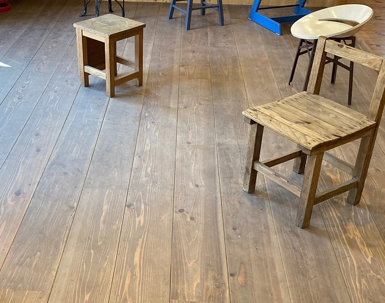 無垢の感触が心地よく、店舗の床や土足で歩行する屋内の空間にお薦めです。無垢材でナチュラルなオイル仕上げなので木質感を生かします。塗装加工品は大きな抜け節などにはパテで処理をしてあります。