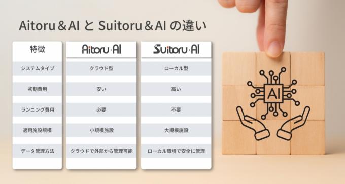 ・Suitoru&AI:大規模施設向けローカル型システムで、高い安定性とランニングコスト削減が特長です。