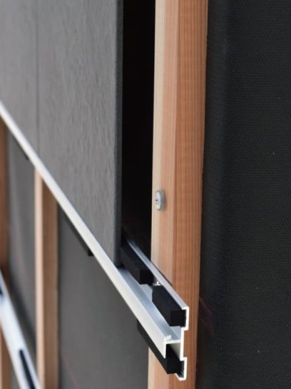 アルミレールは胴縁にビス止めします。タイルは部分的に接着剤を付けてレールに差し込むだけ。これらにより納期が短縮できます。相対的にゴミの軽減につながります。養生期間なども無くなるので工期短縮につながりますし、コスト軽減にもつながります。