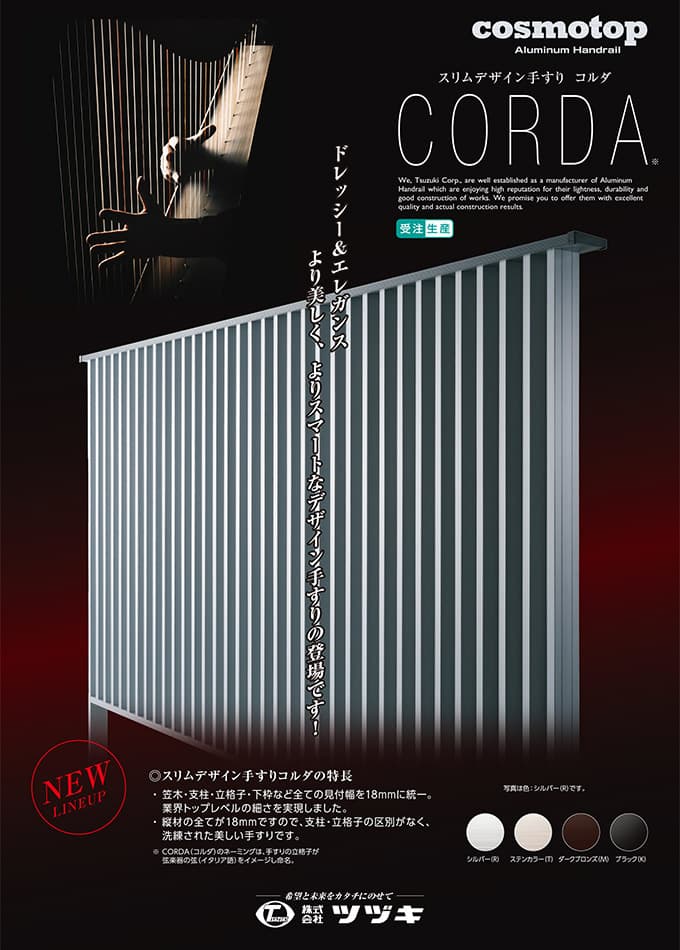 ・新スリムデザイン手すり「CORDA(コルダ)」のネーミングは手すりの立格子が弦楽器の弦(イタリア語)をイメージし作られたことから命名いたしました。