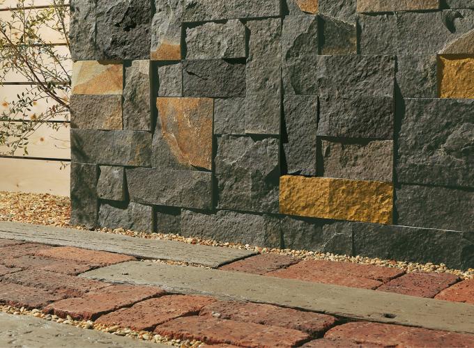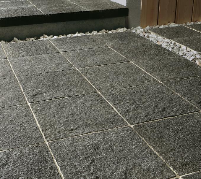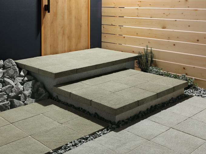 表面のゆるやかなうねりが、光を味方にして陰影を映し出します。春の柔らかな陽射しでは穏やかに、夏の強い陽射しの元ではしっかりと陰影を映し出し、季節だけでなく時々に変化する景色を楽しめます。うねりは意匠性だけでなく、滑り止めとしての効果も。側面のゆるやかな凹凸は目地キープの役割となり、しっかりと敷設されます。また、ステップとして小口が見えても自然な印象です。