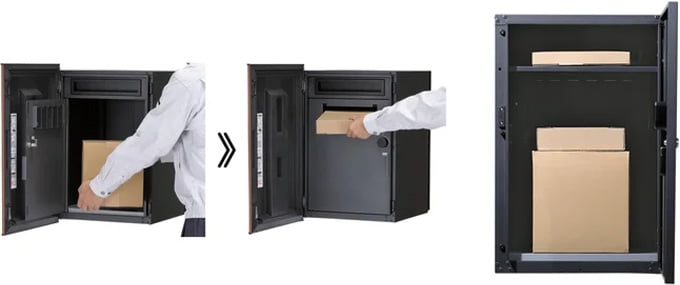 さらに、フラップ構造により施錠後も大型郵便物や小型荷物(W200×H70×D350mm程度)の追加投函が可能です。
