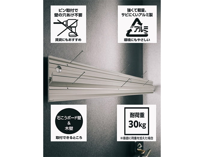 ぐらつきのない安定した取り付けが可能、耐荷重30kgで重たい荷物でも安心です。