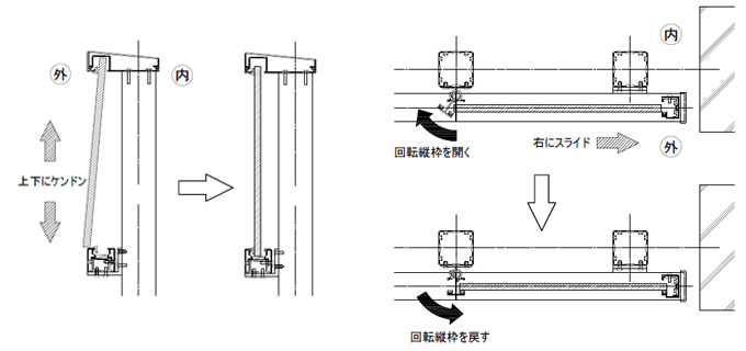 中間縦枠は回転する仕組みで押縁が不要となり、特許を取得している構造です。