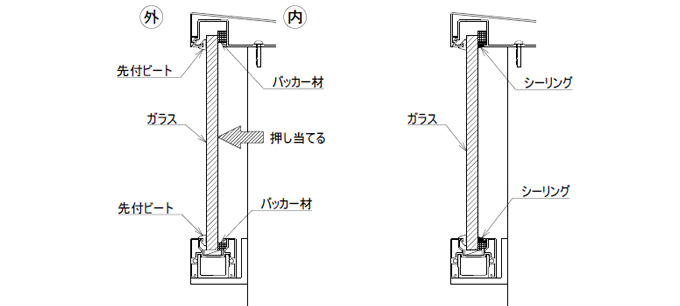 ⑦バッカー材でガラスを外側に押し当て、手すり枠の先付ビートに密着させます。