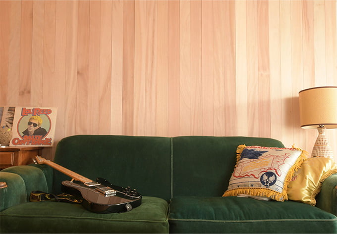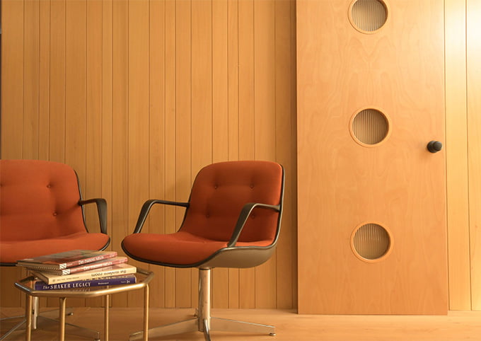 乱巾の心地よいリズム感が飽きのこない壁面を演出し、バーチウッドのドアと同じ色で仕上げているのでミッドセンチュリー特有の洗練されたインテリア空間をお楽しみいただけます。