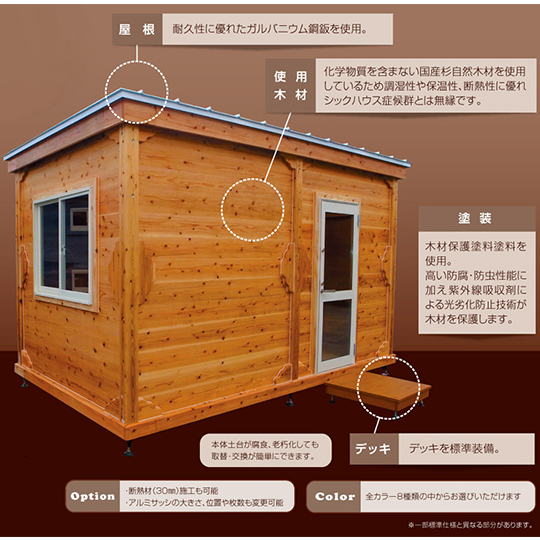 「週末を過ごすセカンドハウスが欲しい」、「子供が落ち着いて勉強できる場所が欲しい」、「趣味に没頭できるスペースを確保したい」、「庭の空いたスペースに事務所が欲しい、店舗が欲しい」・・・そんな皆様の夢を実現するのがこの『レブユニット』です。従来にないお手頃な価格で本格的な木造ユニットハウスをお届けします。