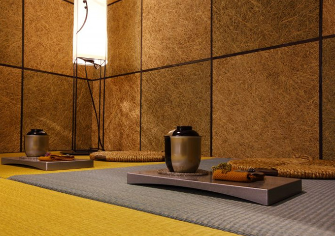 壁面には協同組合エスウッドが開発したイグサボードを採用。このイグサボードは調湿性、断熱性、吸音性、適度な弾力性があり、いやな臭いを消し空気中の有害物質を吸着してくれる理想的な新素材です。