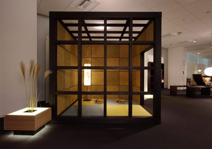 メインの柱にはこだわりのオリジナル集成材柱を使用。壁面のキット化されたウォールパネルは格子戸と明障子をモチーフにイグサボードを貼り合わせ現代風を演出。内装の細部にも様々なアイデアを盛り込み、遊び心と茶室のもつコミュニケーションの場を演出しております。