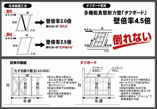 ビスダックジャパンのタフボードは、柱間に専用のパネル材をはめ込み施工するだけで、壁倍率4.5倍の真壁耐力壁を施工できる優れた製品です。
