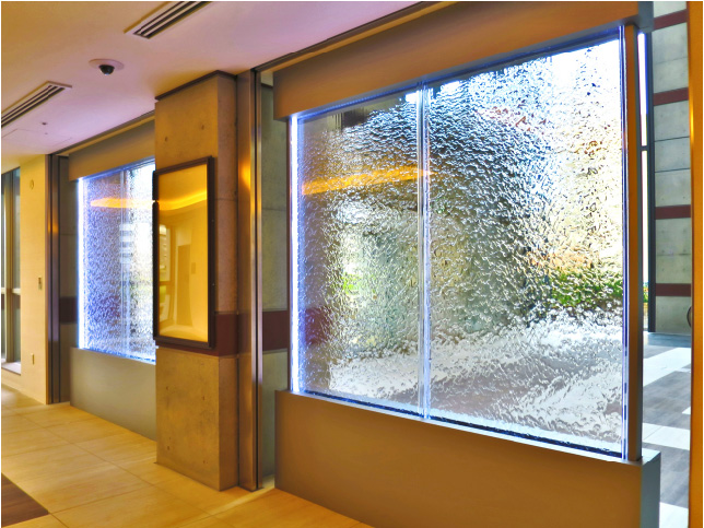 水の透明感や波紋の美しさはそのままに最高レベルのメンテナンス性を確保した、パネルで水の壁を表現する新しい滝のカタチです。