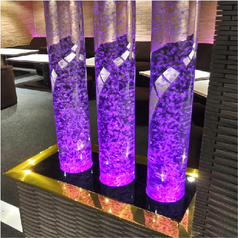 円筒形状のアクリル水槽の中を気泡が上昇するポール(円筒/円柱)型パールエアレーション。360°どの方向からも鑑賞可能なことから空間の中央にアクセントとして設置する使い方に適しています。