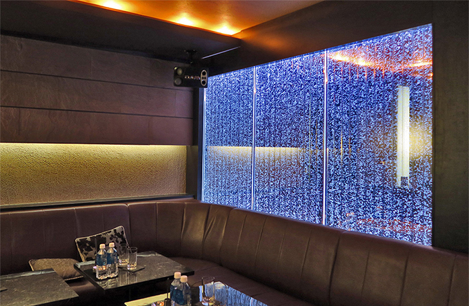 「水」と「泡」で空間を彩るパールエアレーション。真珠のようにキラキラと光りながら繊細な気泡が水の中を上昇する様子は海の中にいるような、まさに水の雰囲気を近くに感じられるタイプの水演出。水も透明、泡も透明、そこに照明を当てることで色々な表情を見せるのもパールエアレーションの特徴の一つ。インテリアの雰囲気やその空間のイメージにあった照明色で空間を彩ります。