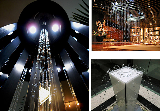 水に特殊な振動波を与えて制御された球体にする噴水装置と、専用のストロボライトを組み合わせることによって起こる残像現象をシステム製品化した当社独自の商品です。