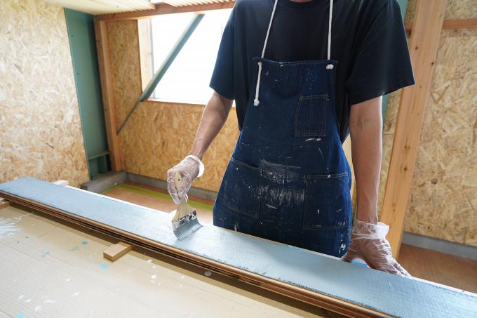 程よく剥がす加工をして、室内の家具との相性の良い色合いに仕上げています。