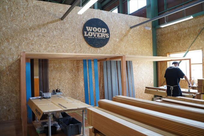 正面の茶色の壁が弊社で製作しているヴィンテージ加工ウッドパネルになります。