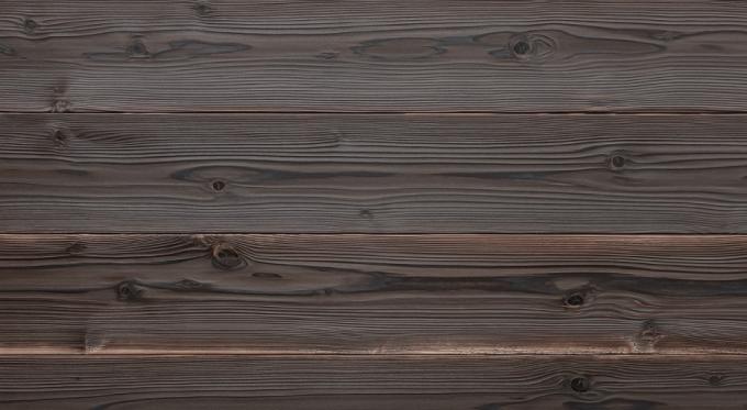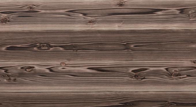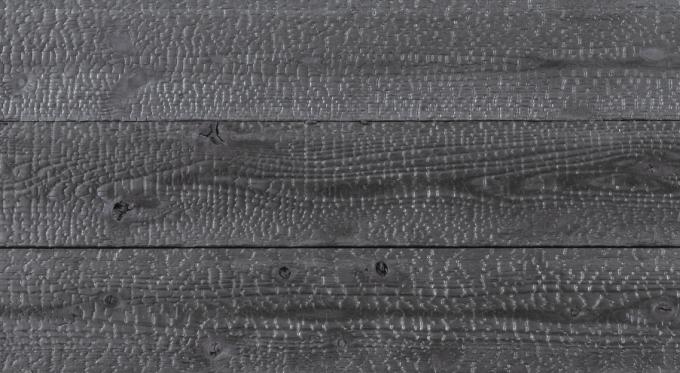 焼いて表面を炭化させることによって、板の劣化を遅らせようとして考えられた、古来よりある焼杉です。クロに水性アクリル樹脂系のクリア塗装を塗布し、表面の炭の凝固を促します。手にも付き難く、焼杉自体の風合いは変わりません。