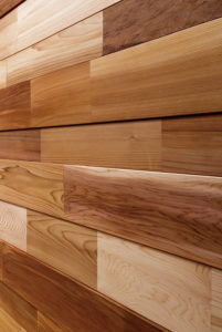 北米のレッドシダーをフローリングのユニのように長さ方向にランダムにつないだ壁材です。
