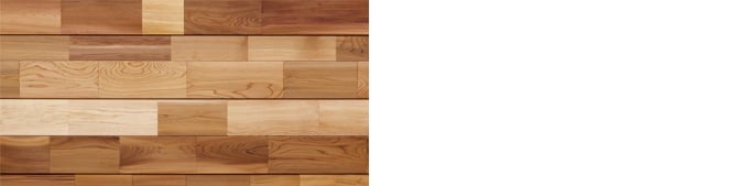北米のレッドシダーをフローリングのユニのように長さ方向にランダムにつないだ壁材です。