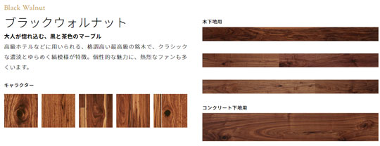 樹種バリエーションは人気のブラックウォルナットとオークで、それぞれ木下地用とコンクリート下地用の2種類、4品番をご用意しております。