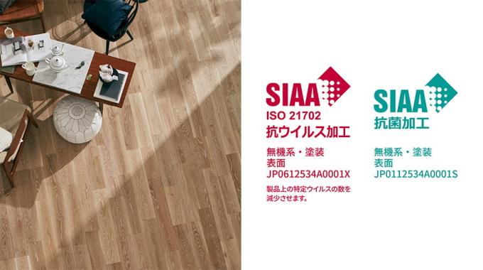 朝日ウッドテック株式会社は、このたび、挽き板フローリングLiveNaturalプレミアムをはじめとする天然木フローリングで、(一社)抗菌製品技術協議会(以下SIAA)による「SIAA抗菌マーク」を取得しました(2020年12月17日)。