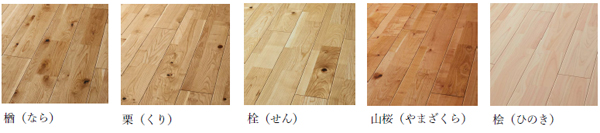 国産材5樹種をラインナップ。「節」や「白太」等、天然木本来のキャラクターも楽しめます。