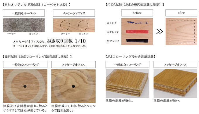 「メッセージオフィス」は、土足使用が前提となるオフィス環境を想定し、摩耗・水分・汚れに強い塗装仕様を採用しています。