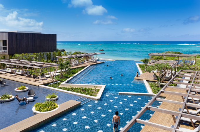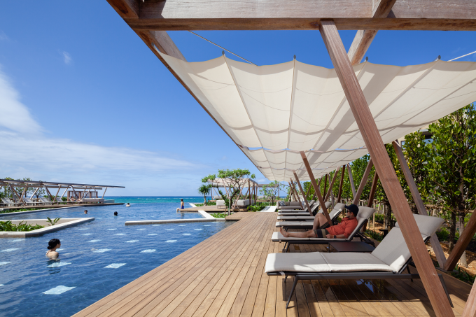 2020年7月にオープンした星のや沖縄では、美しい白浜と透き通った青い海と共に、暮らすような滞在を楽しむことができます。アコヤは腐らない、ささくれない、表情が柔らかいという理由で、サンセットプールや客室のデッキ、手すりなど、素足で歩いたり、人の手が触れる箇所に採用していただきました。
