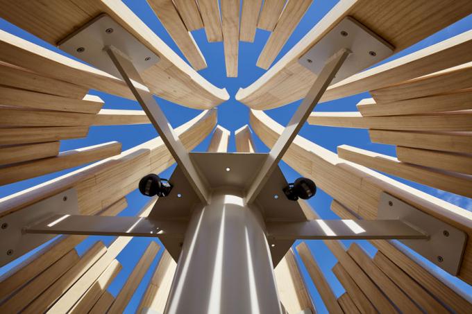 屋根には、環境負荷を抑えつつ自然環境と調和する様に、製材したままの粗い面を表面にしたアコヤ製の屋根葺き材が使われています。(帯鋸で挽いた巾200mmx長さ600mmx厚み約11mmの薄い挽板を約30,000枚)。