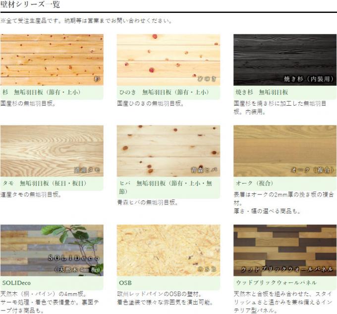 香りのよいヒノキやヒバ等の無垢材、幅の選べるオーク材、不燃下地と組み合わせた突板材等、