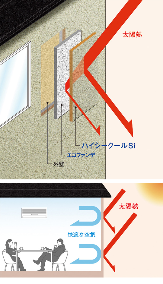 建物の外壁表面に当たる太陽熱を遮熱機能が特長のハイシークールSiが反射し、また下層の断熱機能が特長のエコファンデが外部熱の侵入を減少させます。