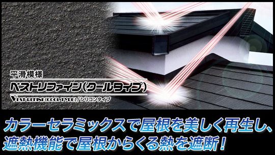 他にも、屋根用塗替え塗材ベストリファイン(クールタイプ)は、セラミックスと高品質のアクリルシリコン樹脂を複合させたハイブリッド屋根用塗替え塗装材です。屋根表面に当たる太陽熱を遮熱機能で遮断し、屋根からくる室内温度上昇を抑えます。