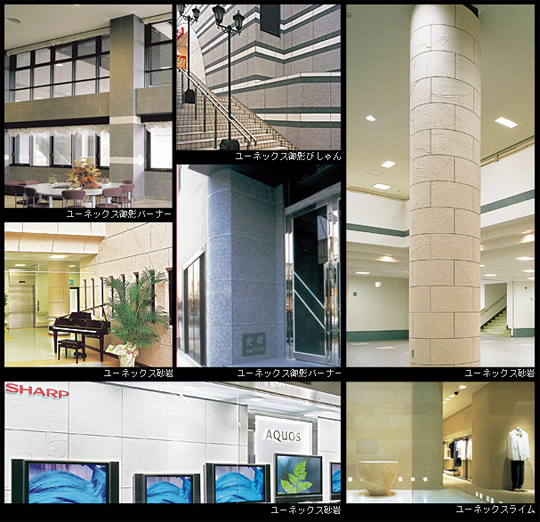 ユーネックスは石の持つ魅力はそのままに、石よりも簡単で手軽に扱えるようにした貼る石材調シート内外装仕上材です。ユーネックスの扱いやすさが、自由自在に壁面における意匠表現の幅を広げます。