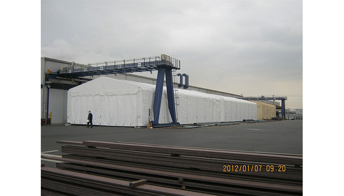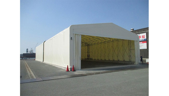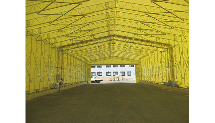 レールに沿って蛇腹式にテントが伸縮するので、クレーンやフォークリフト等の搬出・搬入が容易に行えます。連棟で連結や左右に伸縮など、使い方のバリエーションが豊富です。伸縮操作は、手動式と電動式があります。