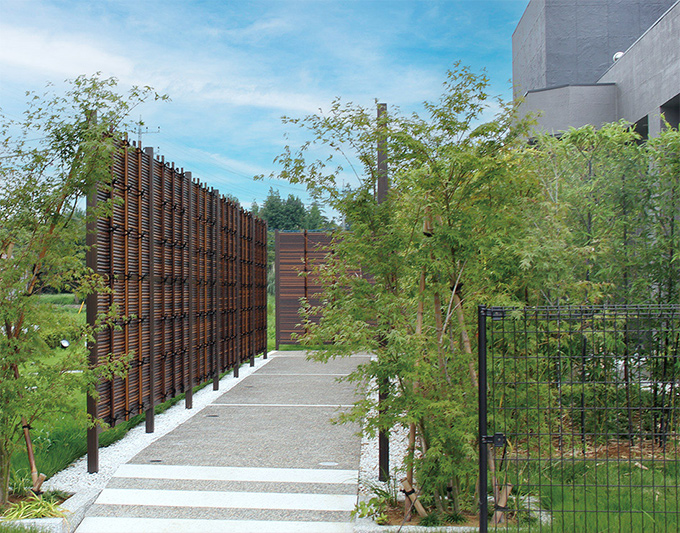 現代風な建築のアプローチに、和の伝統的なデザインの御簾垣。「和モダン」な雰囲気で優しさが感じ取れます。